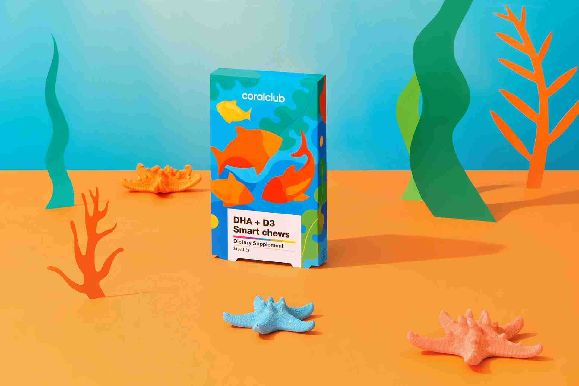 Вкусни дъвки с високо съдържание на Омега-3 (DHA) и витамин D3 за поддържане на когнитивното развитие и имунитета на децата. Продуктът е създаден в Норвегия с помощта на технологията ConCordix, увеличаваща биодостъпността на активните компоненти.