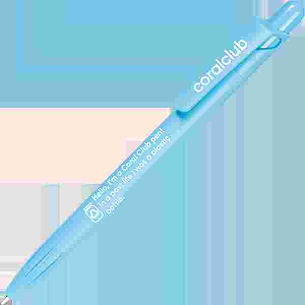 Химикалка от материал PET-RECYCLED с надпис "Привет, аз съм химикалка Корал Клуб! В предишният си живот бях пластмасова опаковка".