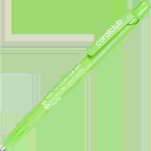 Химикалка от материал PET-RECYCLED с надпис "Привет, аз съм химикалка Корал Клуб! В предишният си живот бях пластмасова опаковка".